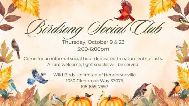 What birds are you seeing around your neighborhood? Come share with us and let's chat about nature, birds, wildlife, or anything else that interests us! All are welcome to join this informal social hour, light snacks will be offered; please bring your own beverage of choice, if you wish.