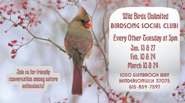 Whether you come to chat or come to just relax, all are welcome to our Birdsong Social Club! We begin our meeting with a brief nature talk and let it roll from there. Please join us.