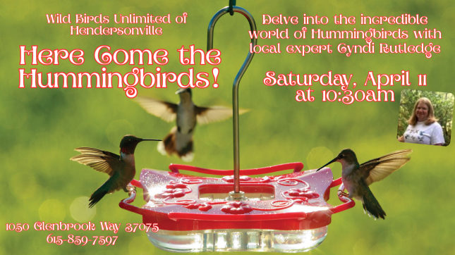 Two thrilling things are happening at the same time~ hummingbirds are returning to our area & local hummingbird expert Cyndi Rutledge is returning to our store! As a local hummingbird bander and President of Southeastern Avian Research, Cyndi Rutledge has amassed a world of knowledge about one of nature's little wonders. Bring a friend and join us for this delightful discussion!